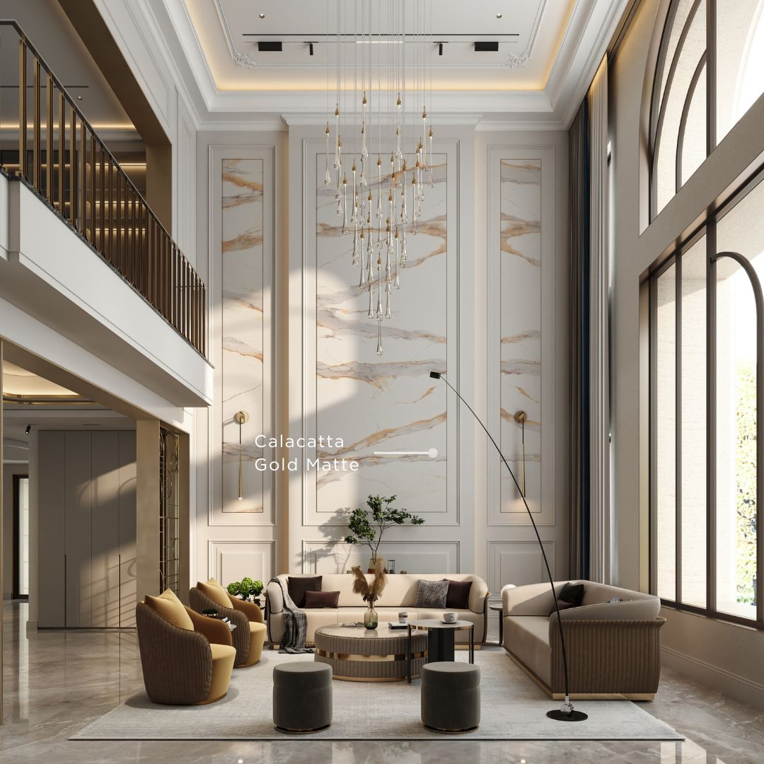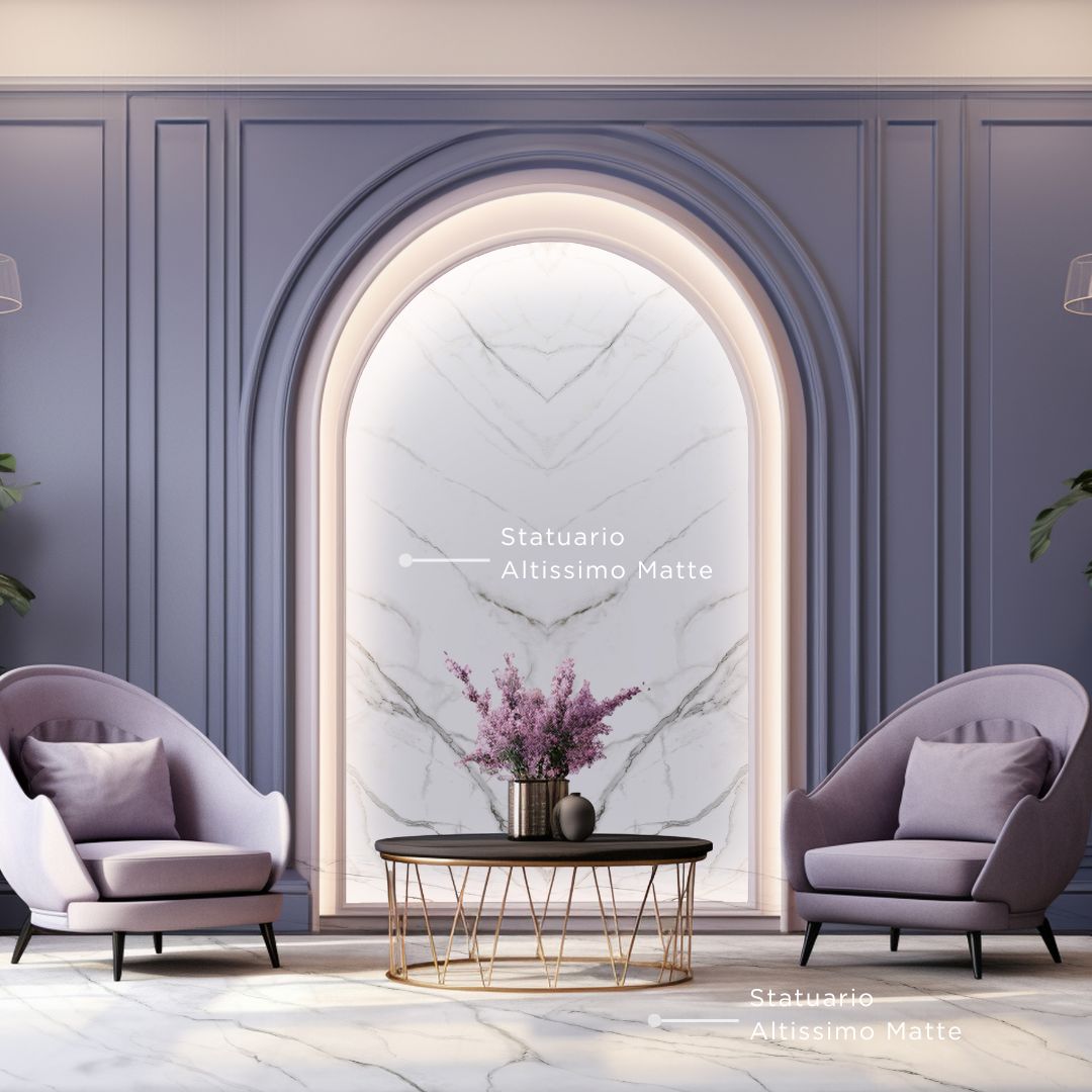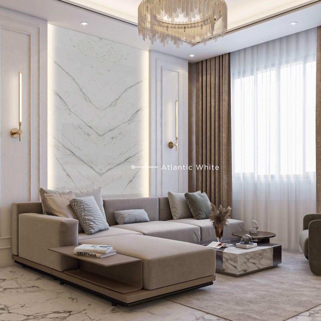 Tips ini menciptakan ritme visual yang nyaman dan menyenangkan. Furnitur yang diletakkan saling berhadapan mendorong percakapan, menjadikan ruang keluarga ini tidak hanya fungsional tetapi juga indah. Kehadiran QUADRA Statuario Altissimo Matte sebagai backwall dan lantai dapat menggabungkan desain klasik dan modern untuk menciptakan ruang keluarga yang mewah dan harmonis.Â