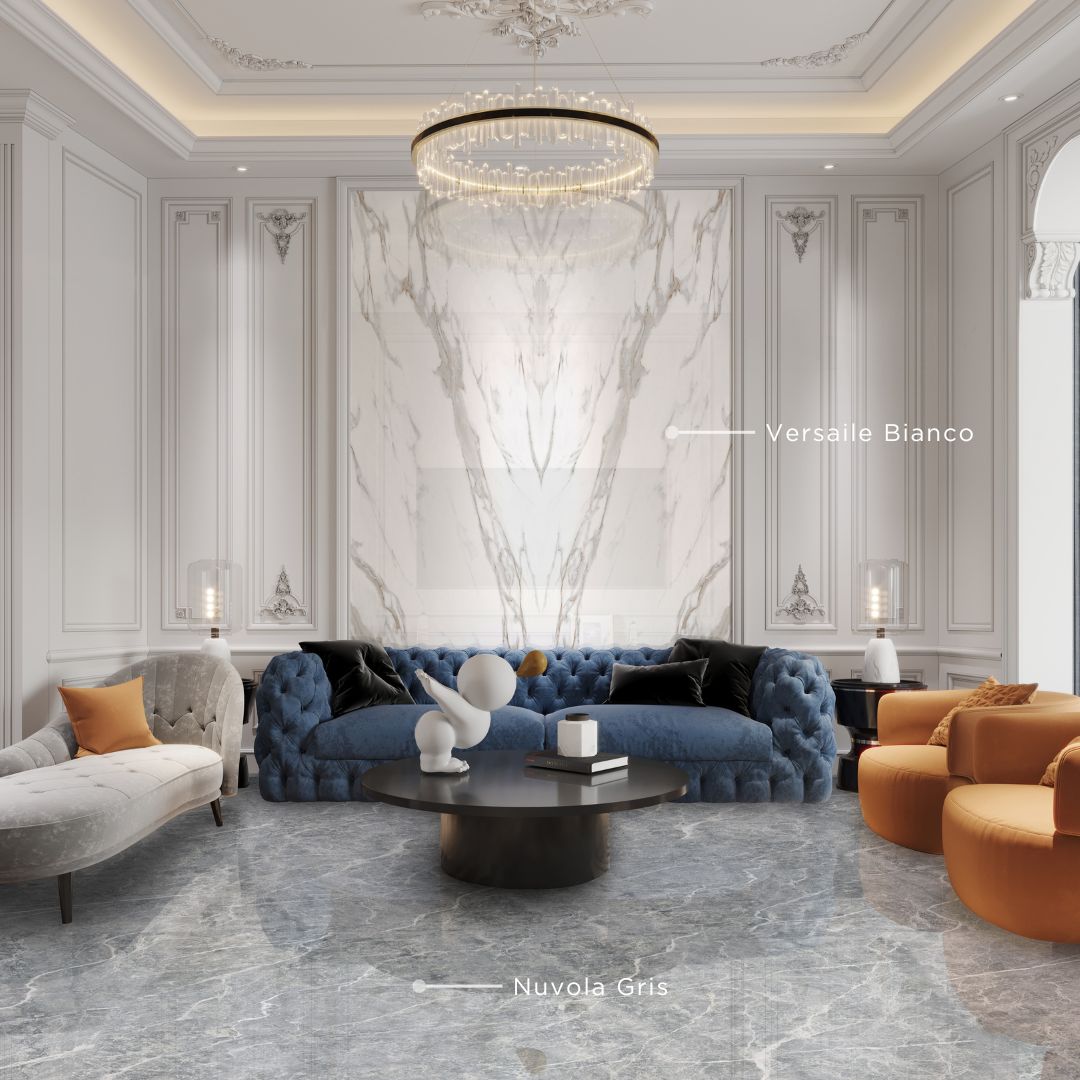 Kombinasi keindahan QUADRA Versaile Bianco dan QUADRA Nuvola Gris juga dapat menggabungkan desain klasik dan modern untuk menciptakan ruang keluarga yang mewah dan harmonis. Keseimbangan antara furnitur klasik dan modern ini akan menciptakan tampilan ruang keluarga yang harmonis dan elegan.