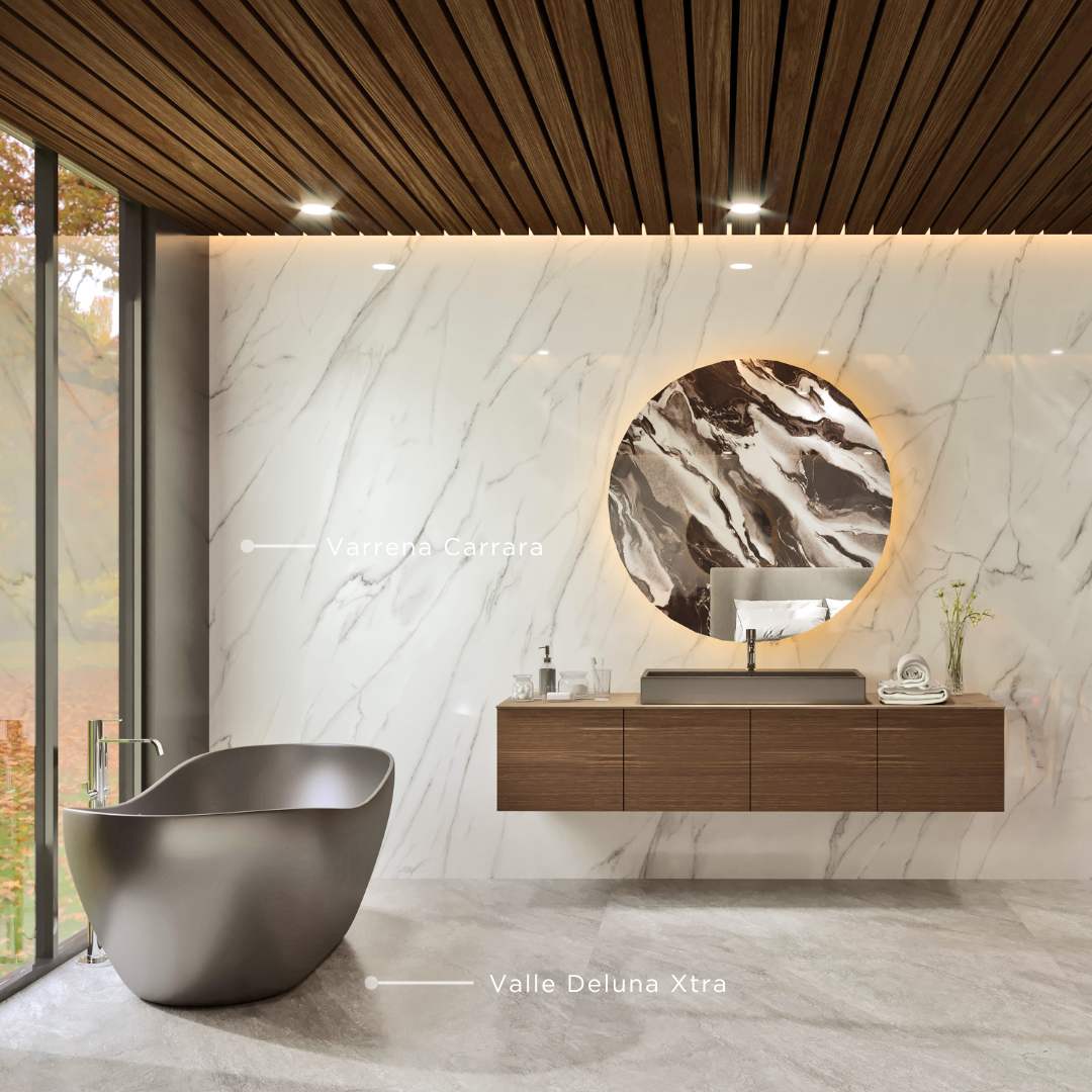 Pastikan warna dan motif dinding senada dengan lantai agar tercipta kesan harmonis. Untuk tampilan lantai kamar mandi yang mewah, Anda dapat memilih QUADRA Valle Deluna Xtra yang memiliki kesan natural dengan finishing Coarse Matte. Selain itu, pilih material dinding yang mudah dibersihkan dan minim pori. Anda dapat memadukan QUADRA Varenna Carrara sebagai dinding untuk membuat desain kamar mandi semakin mewah.  Â