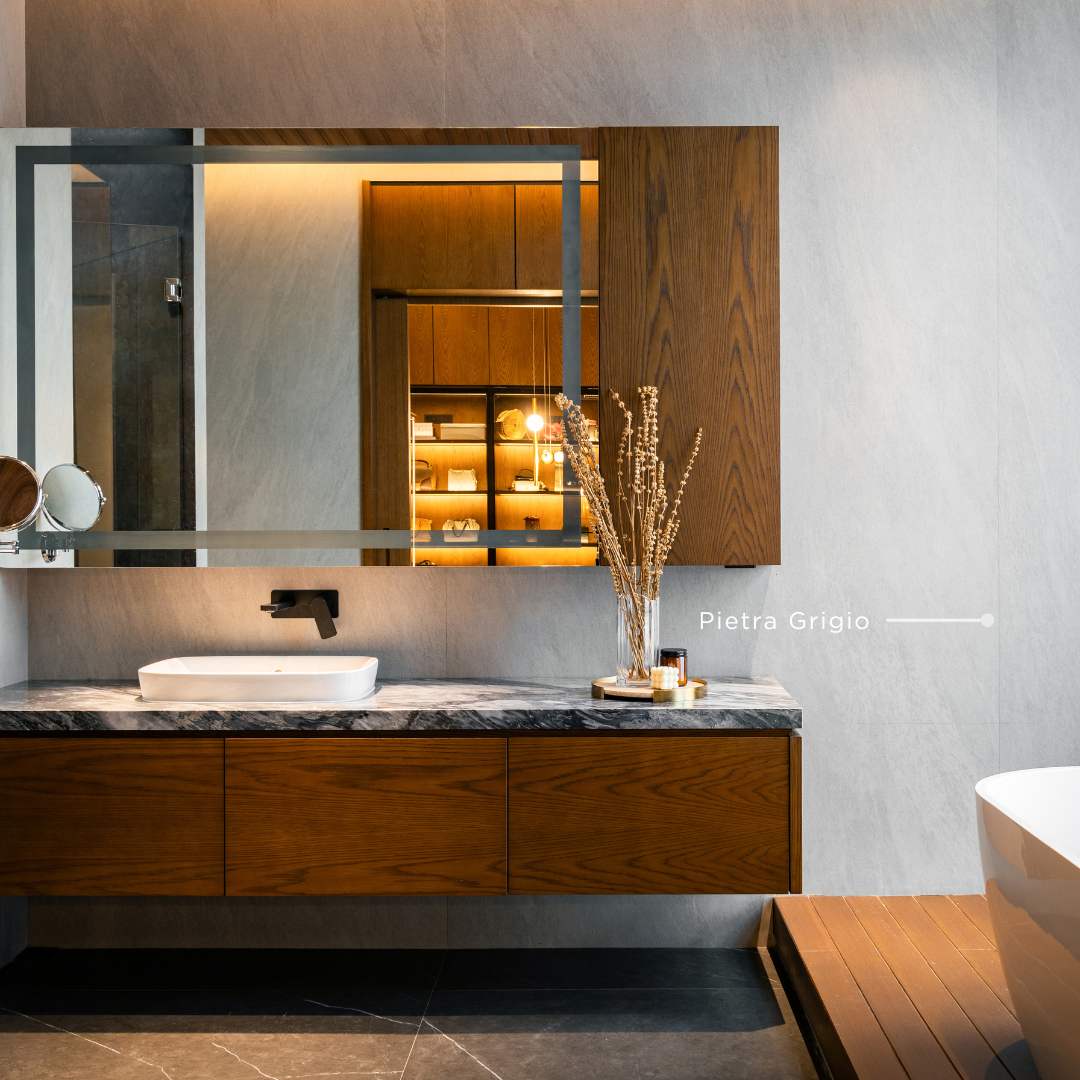 Pilihlah cermin dengan bingkai yang elegan untuk menambah sentuhan kemewahan pada kamar mandi Anda. Anda dapat memaksimalkan desain kamar mandi mewah Anda dengan QUADRA Pietra Grigio sebagai dinding kamar mandi Anda. Selain membuat desain kamar mandi lebih mewah, QUADRA juga dapat membuat desain kamar mandi lebih natural dan menawan.Â