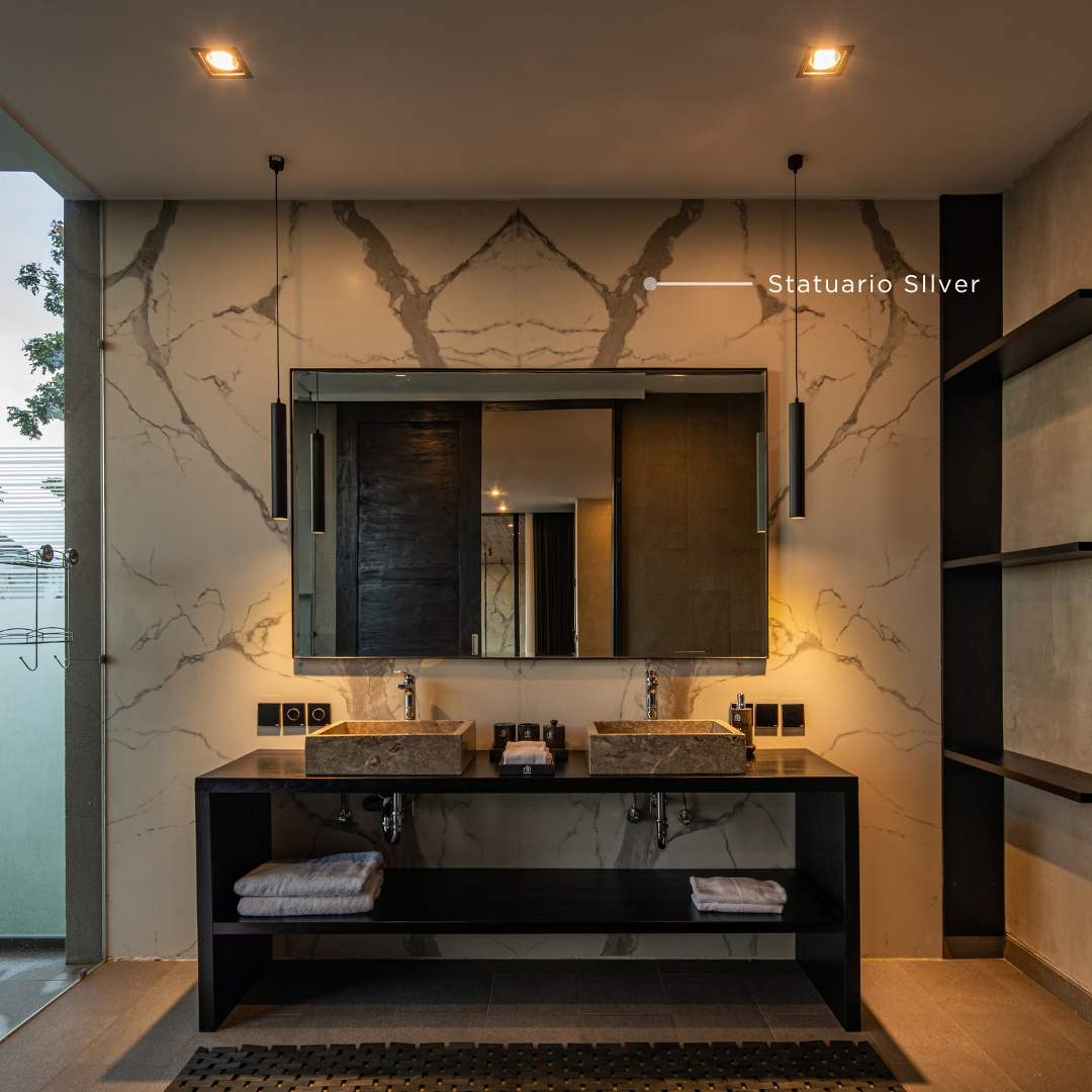 Pencahayaan yang tepat tidak hanya berfungsi secara praktis, tetapi juga menambah estetika kamar mandi. Untuk menghadirkan suasana yang lebih mewah, Anda dapat memilih QUADRA Statuario Silver sebagai dinding kamar mandi Anda. Dengan finishing shiny-polished, QUADRA dapat memberikan pantulan cahaya yang elegan ala kamar mandi hotel.