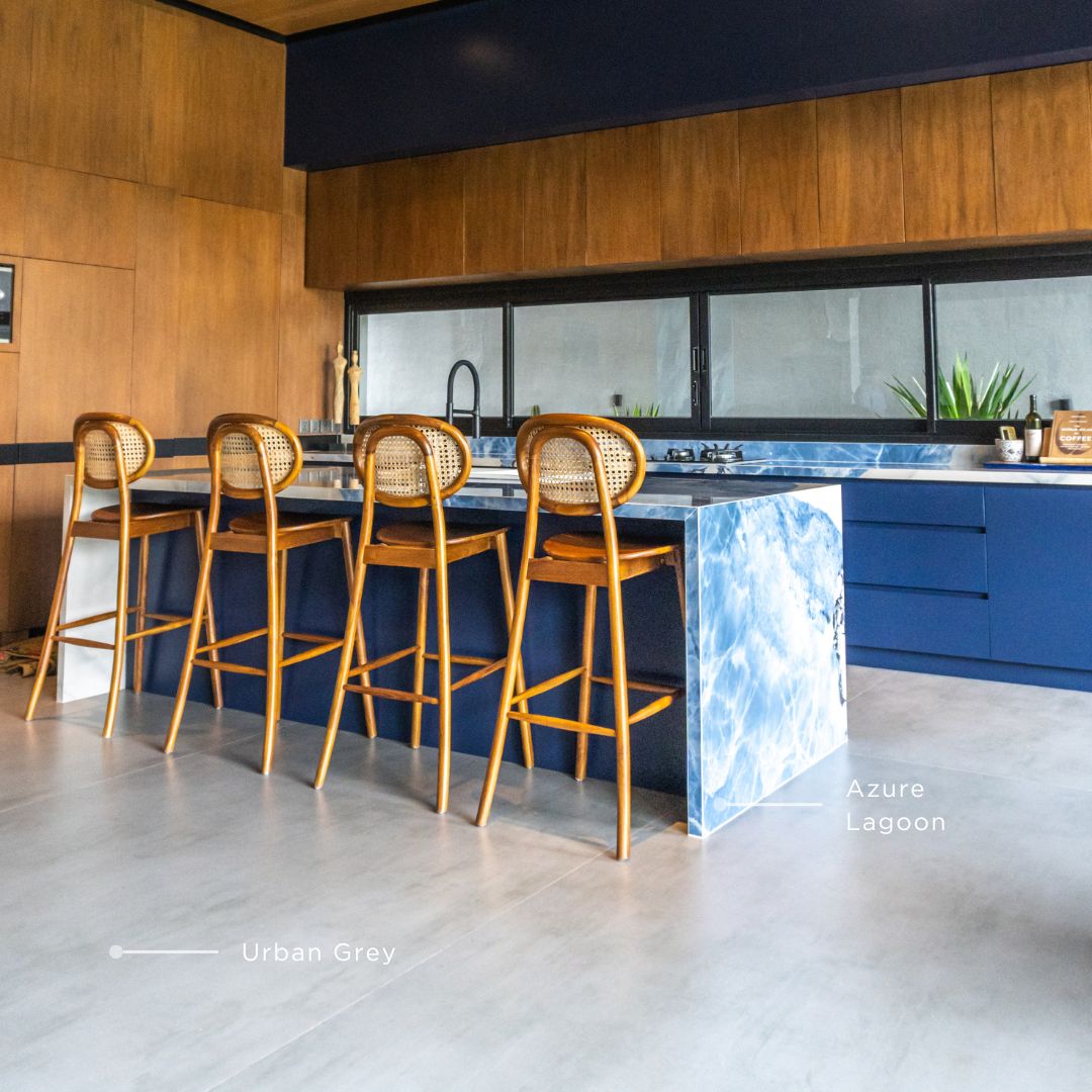 Desain interior rumah mewah ala villa Bali juga dapat dicapai dengan memadukan gaya modern dan tradisional. Anda dapat memadukan unsur kontemporer, seperti furnitur dan dekorasi minimalis dengan sentuhan etnik Bali, seperti ukiran kayu, patung di dalam rumah Anda. Anda juga dapat memberikan sentuhan etnik melalui QUADRA Azure Lagoon pada dapur Anda. Selain itu, penggunaan QUADRA Urban Grey sebagai lantai dapat memberikan sentuhan industrial modern.