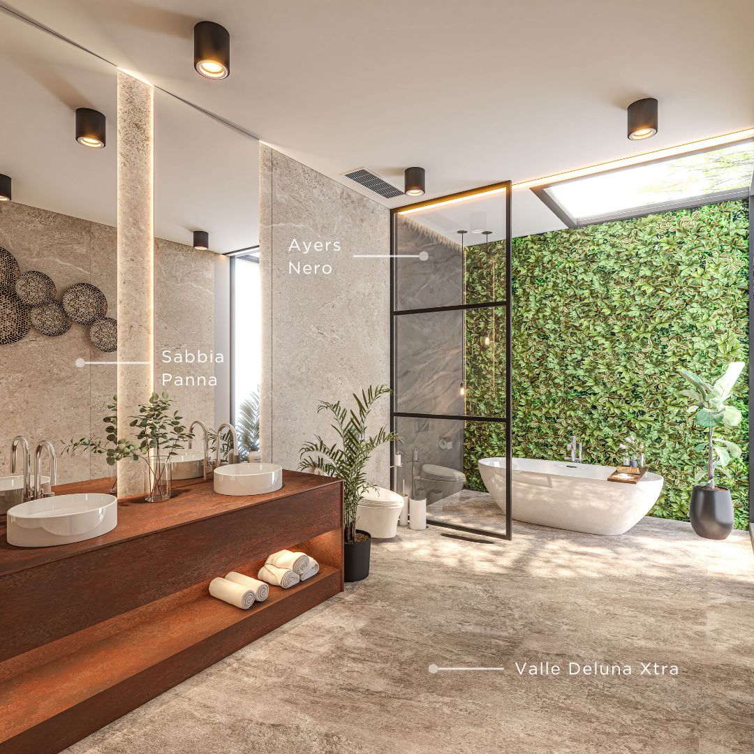 Perhatikan juga penggunaan warna-warna terang pada elemen interior di sekitar jendela dan skylight. Memilih warna earth tone untuk rumah Anda adalah langkah tepat untuk menciptakan kesan alami dan mewah ala villa di Bali. Warna-warna seperti coklat, krem, hijau, dan terracotta membawa nuansa keindahan alam Bali. Warna tersebut dapat Anda temukan pada QUADRA Valle Deluna, Sabbia Panna, dan Ayers Nero.Â