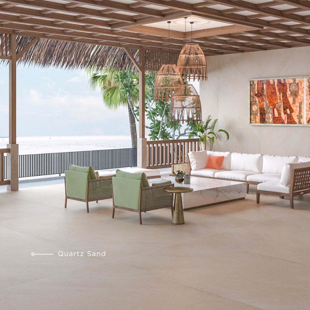 Karena rumah dekat pantai sering kali terkena pasir dan air laut, penting untuk memilih material lantai yang tidak hanya mudah dibersihkan tetapi juga tahan terhadap kelembapan. Rekomendasi terbaik adalah menggunakan material dari Quadra. Material ini tidak berpori, sehingga tidak menyerap air dan mudah dibersihkan dari pasir yang menempel. Sintered stone juga tahan lama dan tidak mudah tergores, menjadikannya pilihan yang tepat untuk menjaga estetika lantai rumah tetap prima dalam waktu yang lama. Material ini cocok untuk rumah pantai yang membutuhkan daya tahan ekstra.