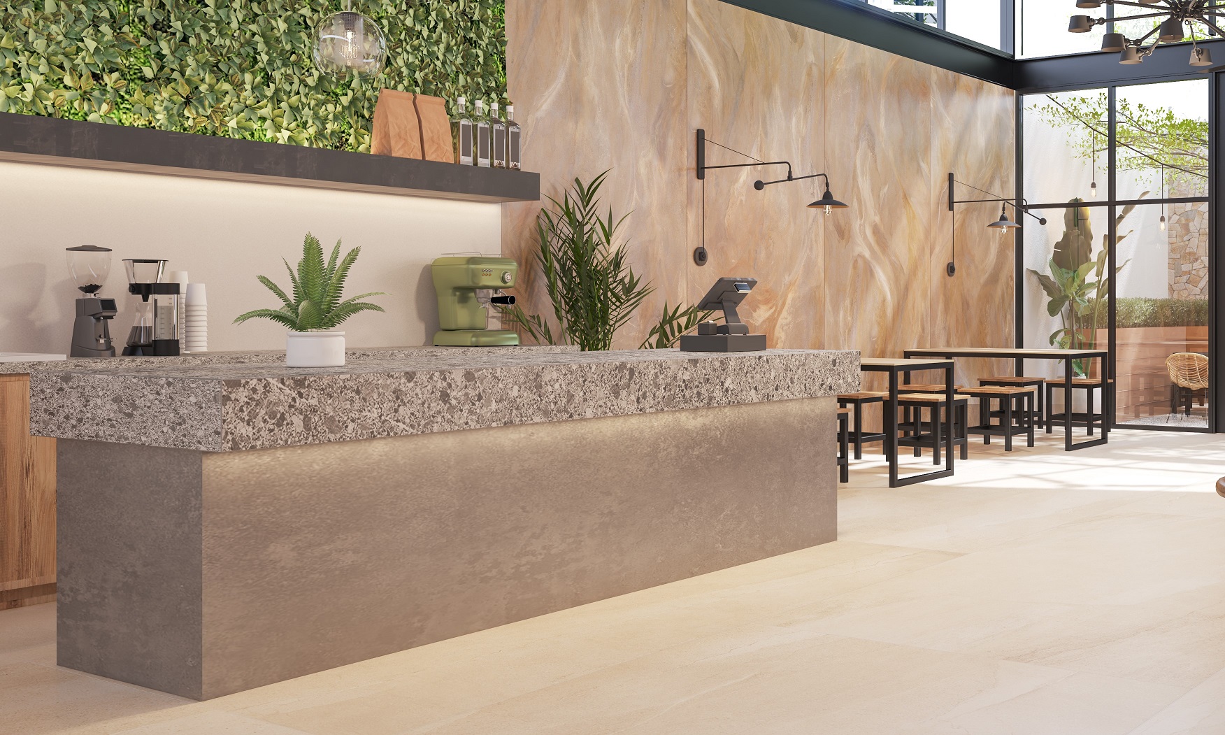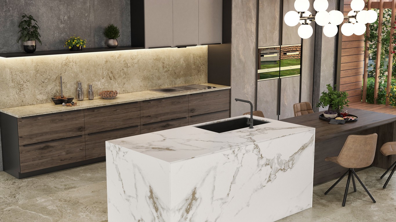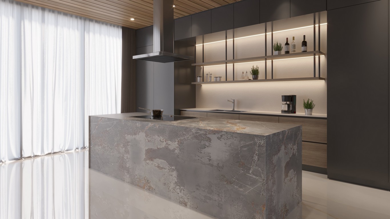 Etna Scuro dan Ferro Marmo merupakan contoh batu sinter dengan motif striking yang dapat Anda gunakan untuk membangun sebuah island utuh di tengah dapur.