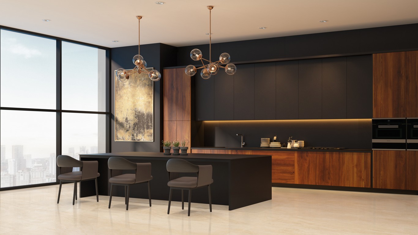 Gelap pekat seperti Nebula Nero atau Marquina Nero Matte dengan warna dasar hitam akan tampak menyatu dengan sluruh desain interior dapur yang memiliki nuansa gelap.
