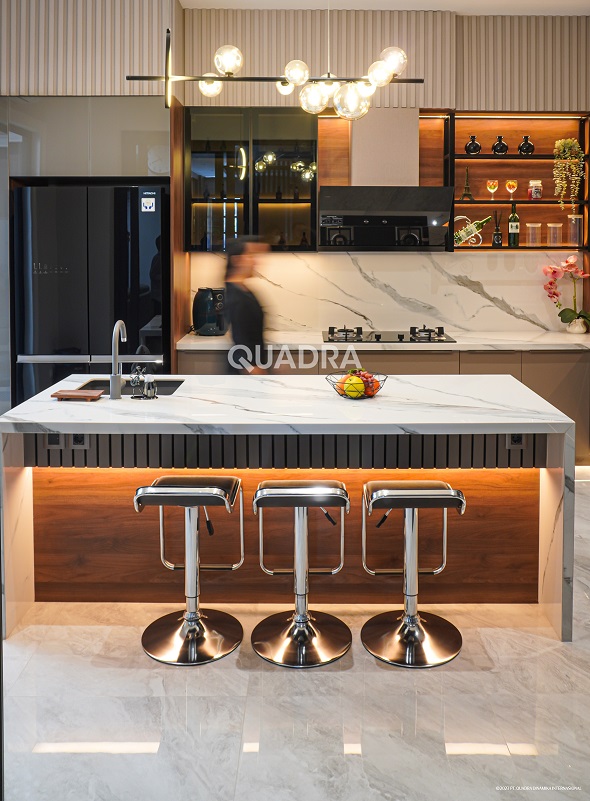 Putih dan hitam seolah telah menjadi pasangan sejak lama. Tentu saja jangan aplikasikan terlalu banyak warna hitam di dalam ruangan karena ruangan akan menjadi terlalu gelap. Kombinasikan QUADRA marmer putih dan motif lain yang berwarna hitam untuk menciptakan nuansa hangat. Tambahkan furnitur hitam, aksen kayu, atau kuningan yang akan menyuntikkan kehangatan lebih banyak ke dalam ruangan.