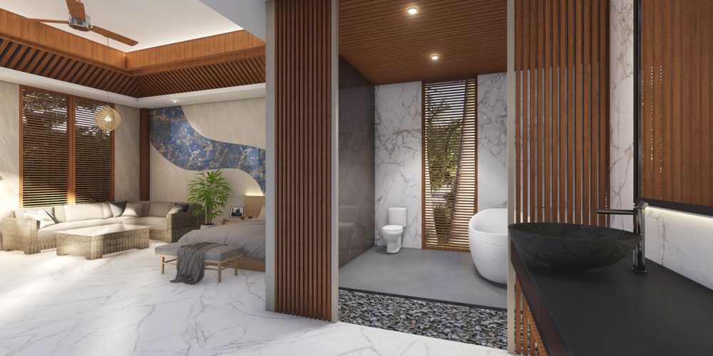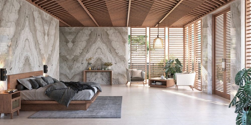 Kayu dan motif putih QUADRA memberi kesan lapang, cerah, dan nyaman (Motif : Travertine Crema & Angel Wings)
