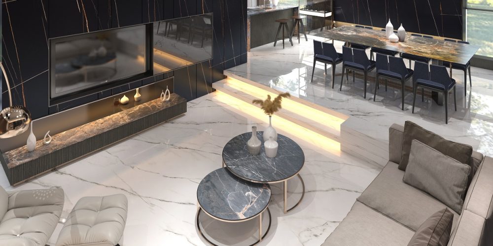Lantai QUADRA motif putih dan kayu gelap memberikan detail yang tidak membosankan (Motif : Statuario Altissimo Matte, Pietra Crema, Tavarez Bianco Matte, Sodalite Blue)