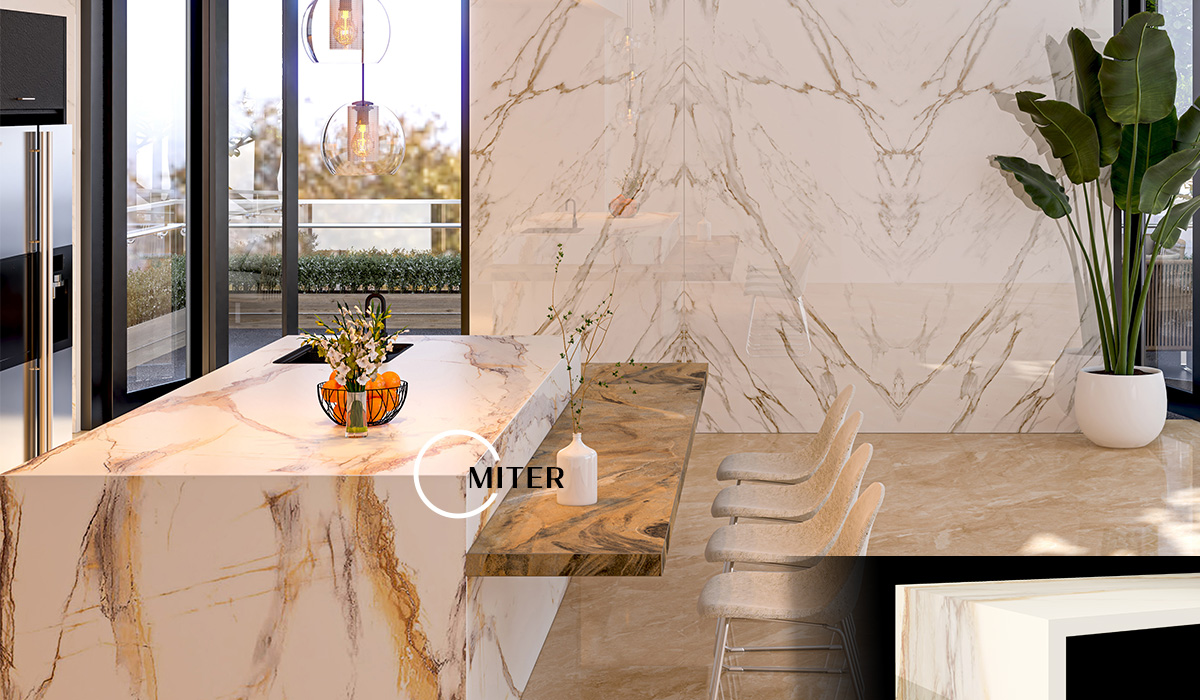 Tepian mitered edge bertujuan untuk menciptakan tampilan motif batu sinter pada countertop yang menyatu dengan batu sinter pada panel sisi, seolah menggunakan batu sinter yang sangat tebal. Untuk menyembunyikan struktur penopang di bawah island, gunakan batu sinter yang lebih panjang, hingga menyentuh lantai, sehingga island akan terlihat seolah terbuat dari satu bongkah batu yang sangat besar.