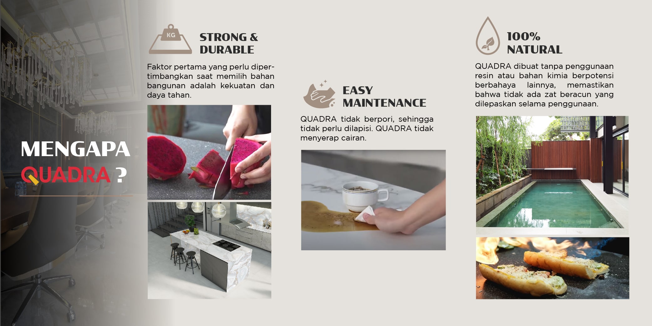 Jika Anda sedang membangun rumah ataupun renovasi dalam beberapa tahun belakangan ini, mungkin Anda sudah tidak asing dengan produk sintered stone. Produk alternatif untuk pelapis lantai, dinding dan countertop ini mulai dikenal kehadirannya sebagai material inovatif pengganti batuan alam. Produk ini diproses dengan tekanan dan suhu tinggi sehingga menghasilkan material yang hampir tidak berpori, yang menjadi salah satu keunggulannya. Quadra sebagai pelopor sintered stone di Indonesia, memulai bisnisnya di tahun 2018 dan berkembang menjadi produsen sintered stone dengan pabrik di Indonesia.