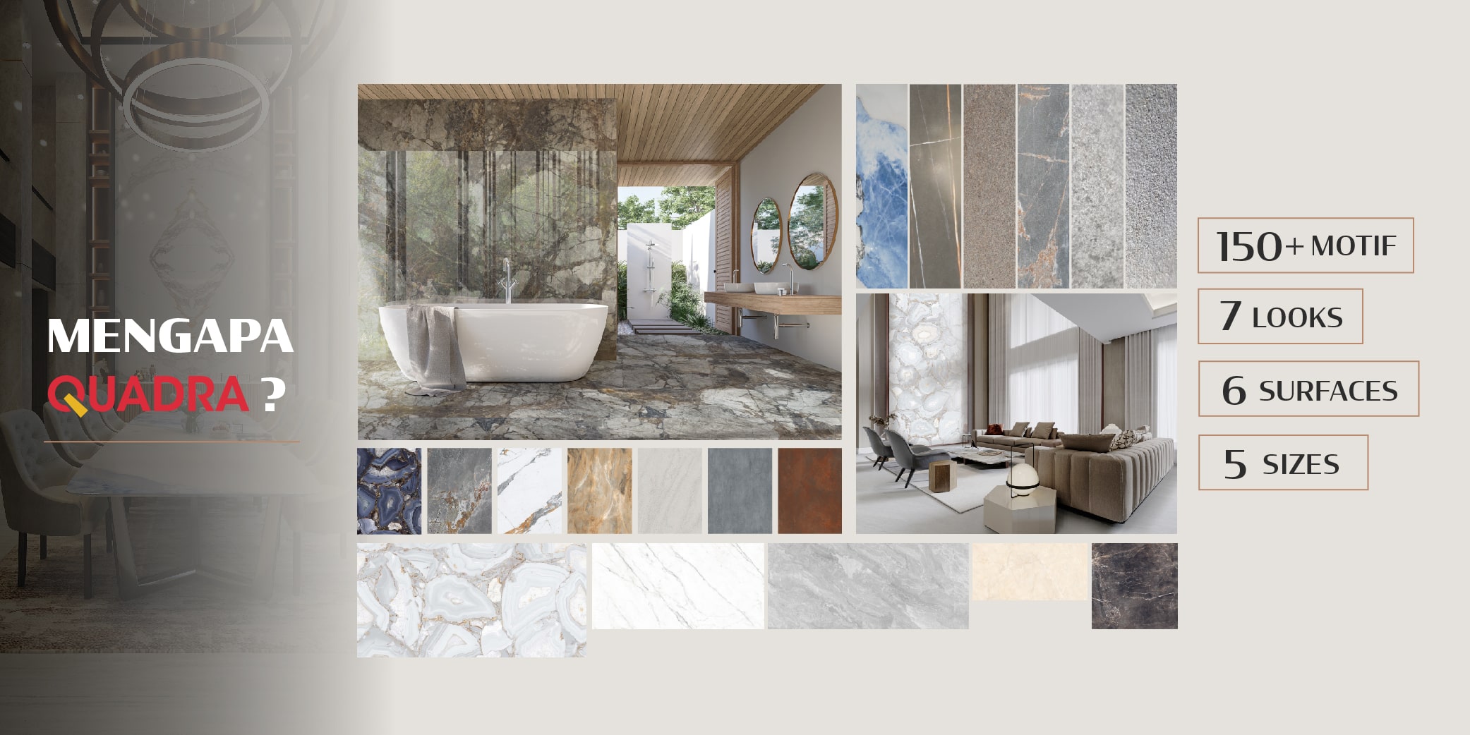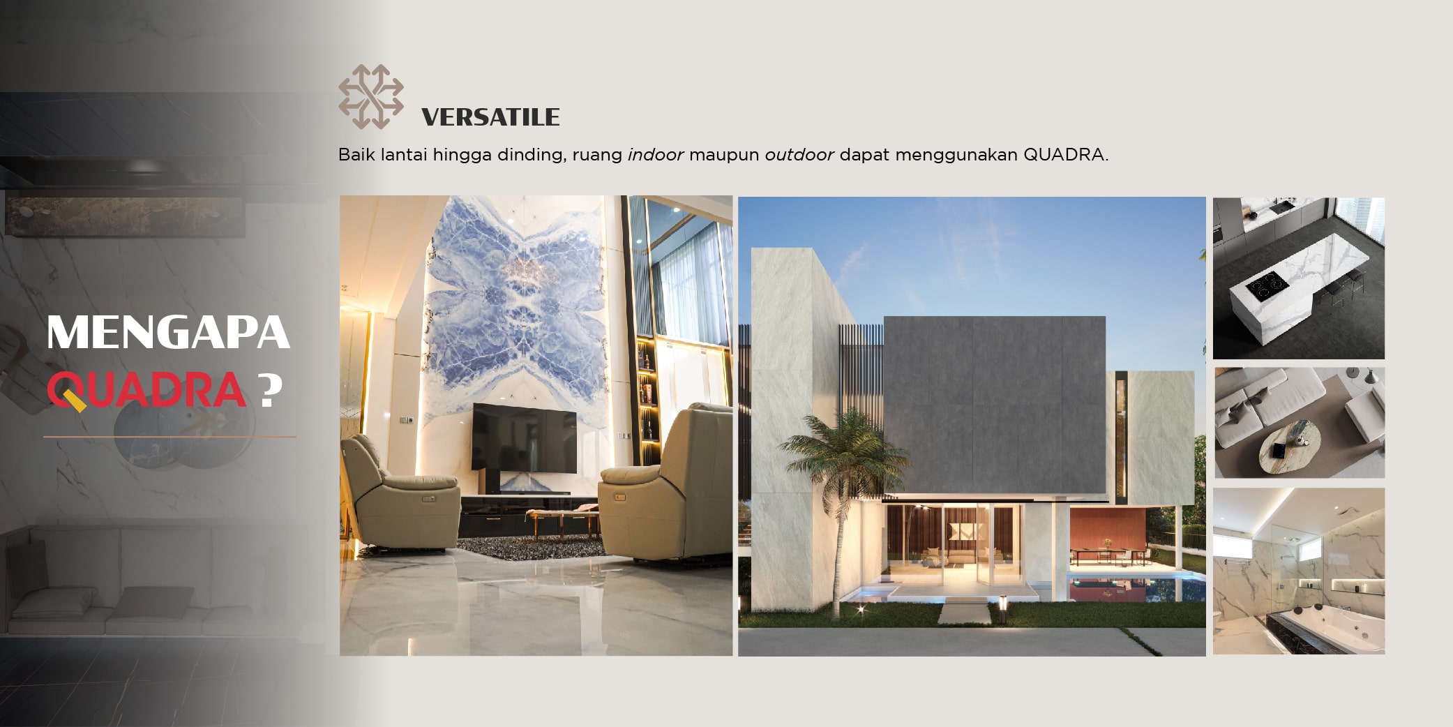 Dengan berbagai keunggulan sintered stone, seperti perawatannya yang mudah, ketahanan terhadap UV, goresan, dan noda, serta berbagai keunggulan Quadra seperti fitur bookmatch & endmatch, variasi tampilan dengan total lebih dari 150 motif, variasi ukuran dan tekstur, menjadikan sintered stone dilirik sebagai material untuk digunakan baik di dalam maupun di luar ruangan. Bukan hanya digunakan untuk rumah pribadi, sintered stone juga sudah banyak digunakan di kantor, restoran, hotel, bahkan rumah ibadah. Karena produksinya yang dilakukan di Indonesia, Quadra menjadi pilihan bagi para arsitek dan interior desainer karena kepastian ketersediaan stok dan cepatnya pengiriman barang ke lokasi proyek.